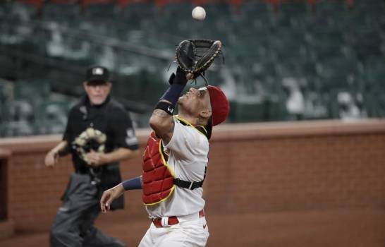 El receptor Yadier Molina de los Cardenales de San Luis fue uno de los jugadores positivos al coronavirus. (AP/Jeff Roberson)