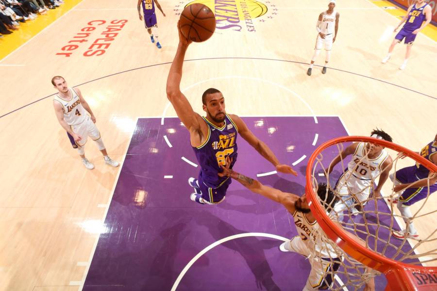 En foto del 14 de diciembre del 2019 Rudy Gobert del Jazz de Utah clava el balón en el encuentro ante los Lakers de Los Ángeles. El domingo 20 de diciembre del 2020 Gobert firmó una extensión de contrato por el Jazz y de acuerdo con una persona con conocimiento del acuerdo es por 5 años y 205 millones de dólares. (AP PHOTO/RICK BOWMER)