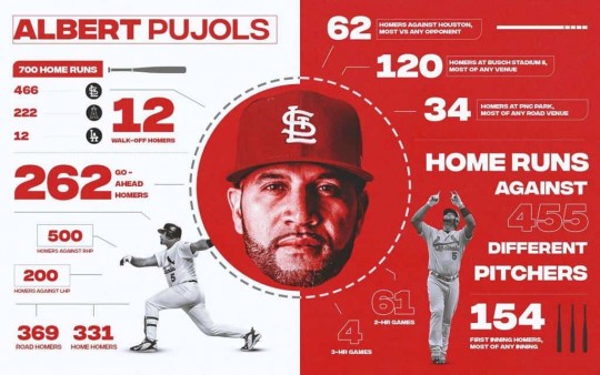 De los 700 cuadrangulares, 500 fueron conectados contra lanzadores derechos y 200 frente a zurdo; 368 productores de carreras y 331 fueron jonrones solitarios, 62 contra los lanzadores de los Astros de Houston, mayoría contra cualquier oponente y 120 jonrones en Busch Stadium, su hogar en San Luis, más que en cualquier lugar y 34 jonrones en Pinc Park de los Piratas de Pittsburgh, en Pensilvania, la mayor parte de cualquier lugar de la ruta.