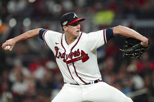 Kyle Wright, de los Bravos de Atlanta, labora en su apertura durante el segundo juego de la serie divisional ante los Filis de Filadelfia, el miércoles 12 de octubre de 2022 (AP/JOHN BAZEMORE)