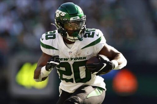 El running back Breece Hall corre con el balón por los Jets de Nueva York ante los Dolphins de Miami, el domingo 9 de octubre de 2022, en East Rutherford, Nueva Jersey. (AP Foto/Adam Hunger)