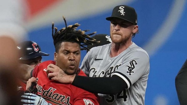 En foto del sábado 5 de agosto del 2023, Michael Kopech de los Medias Blancas de Chicago sostiene al dominicano José Ramírez de los Guardianes de Cleveland durante una pelea con Tim Anderson. (AP/SUE OGROCKI)
