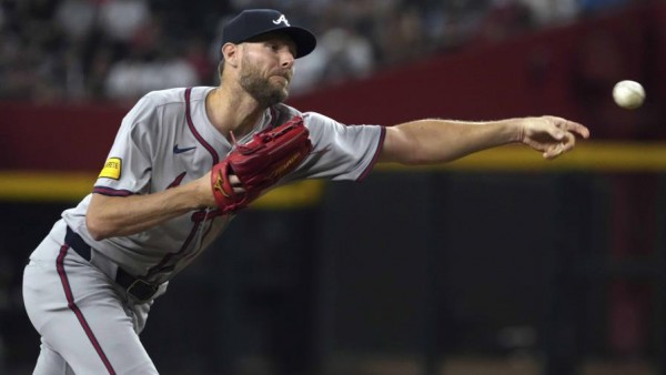 El lanzador de los Bravos de Altanta, Chris Sale lanza ante los Diamondbacks de Arizona durante el primer episodio de un juego de béisbol, el martes 9 de julio de 2024, en Phoenix. (AP/RICK SCUTERI)
