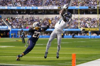 El wide receiver DK Metcalf (14), de los Seahawks de Seattle, salta en su intento de atrapar un pase ante el cornerback J. [...]